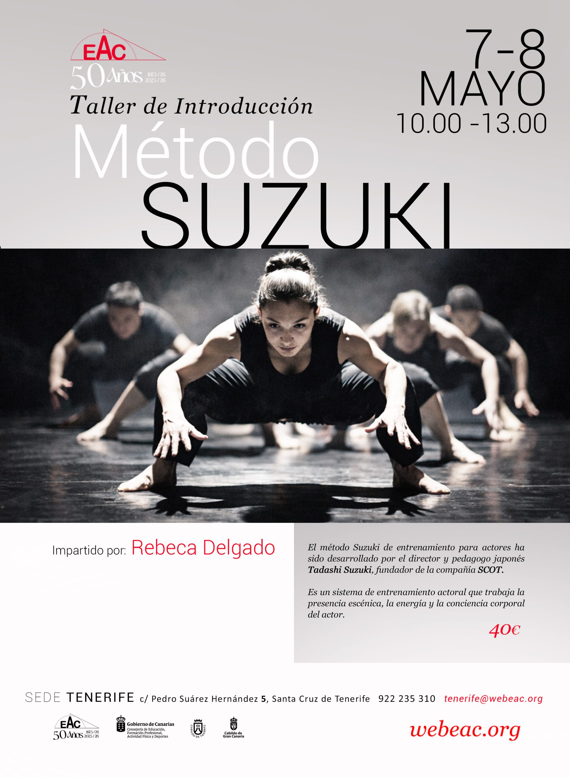 El método Suzuki de entrenamiento para actores ha sido desarrollado por el director y pedagogo japonés Tadashi Suzuki, fundador de la compañía SCOT. Es un sistema de entrenamiento actoral que trabaja la presencia escénica, la energía y la conciencia corporal del actor. No se trata de aprender formas externas, sino de entrenar un cuerpo capaz de sostener atención, intensidad y precisión en escena, incluso en la quietud.